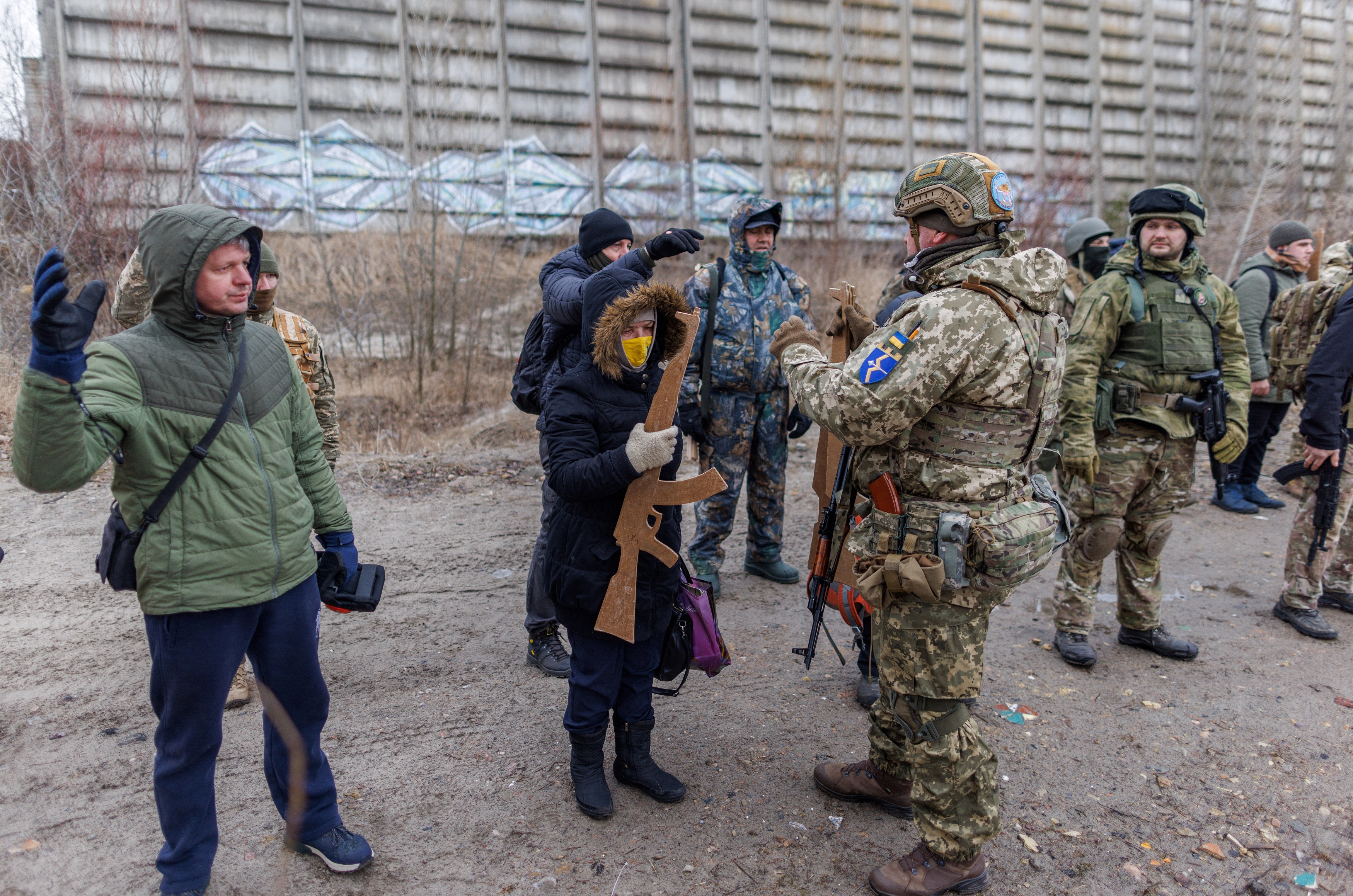 Ārā līst, taču pie bijušās asfalta rūpnīcas Kijevas nomalē kombinezonos tērpti cilvēki nelielās grupās trenējas taktiskos vingrinājumos. Rokās viņiem pneimatiskās šautenes un no koka izgrebti Kalašņikova modeļi, bet dažiem ir arī īstas karabīnes. Tie ir Ukrainas civiliedzīvotāji, kuri grib būt gatavi vajadzības gadījumā aizstāvēt valsti un stāties pretī ienaidniekam.