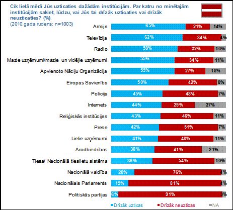 2010.gada rudenī veiktajā pētījumā secināts, ka uzticība bruņotajiem spēkiem kopš pagājušā gada pavasara ir pieaugusi par 21 procentu (no 44 līdz 65%). Straujš pieaugums bija vērojams arī policijai (no 31 līdz 45%), tomēr jāņem vērā, ka aptauja veikta pirms janvāra asiņainajiem notikumiem Jēkabpilī, kur policisti piedalījās bruņotā laupīšanā.