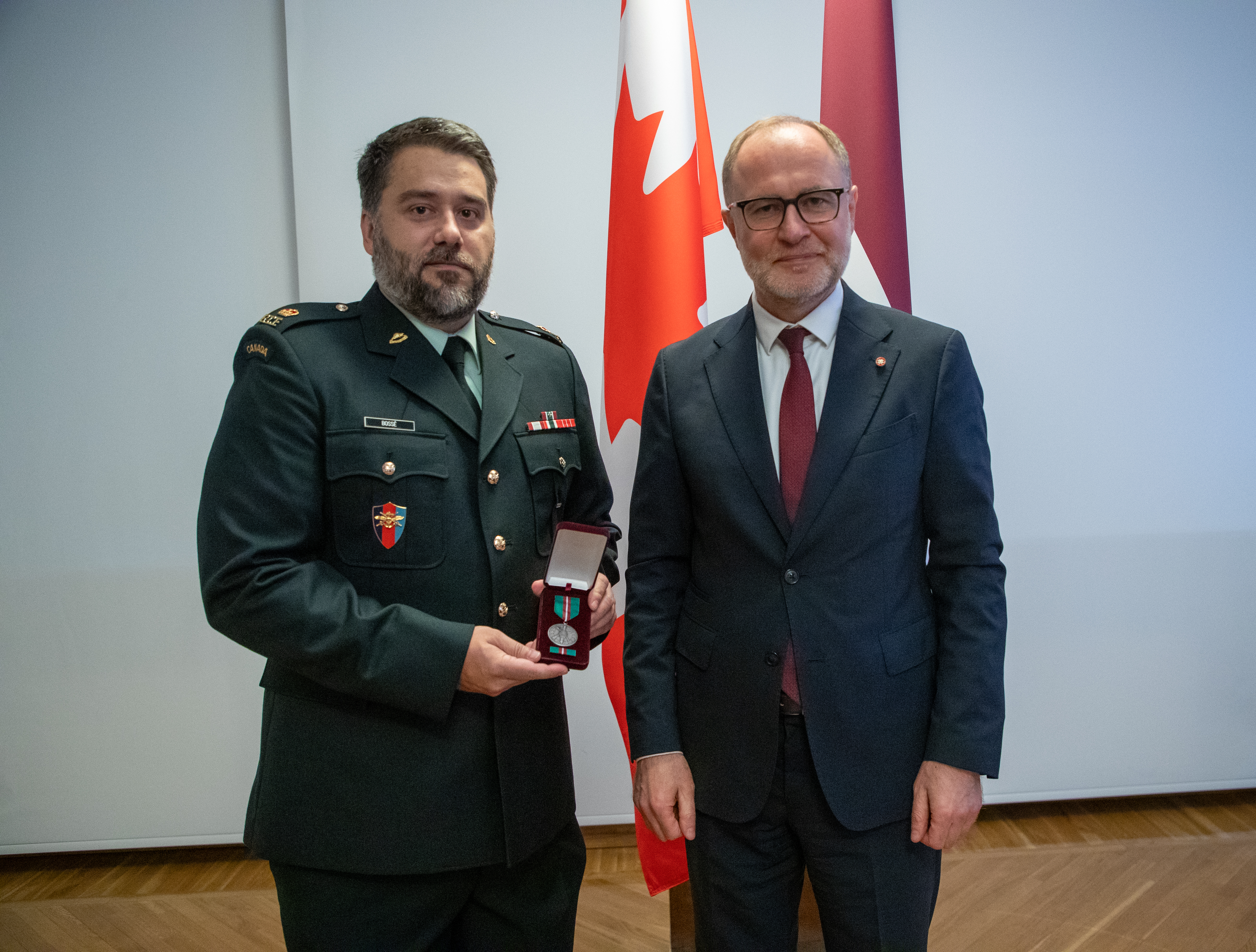 Aizsardzības ministrs Andris Sprūds Kanādas bruņoto spēku pavēlniecības Latvijā galvenajam inženierim majoram Maksimam Bossē (Maxime Bosse) pasniedza apbalvojumu “Par ieguldījumu bruņoto spēku attīstībā” par nozīmīgu darbu Kanādas infrastruktūras projektu īstenošanā Latvijā.