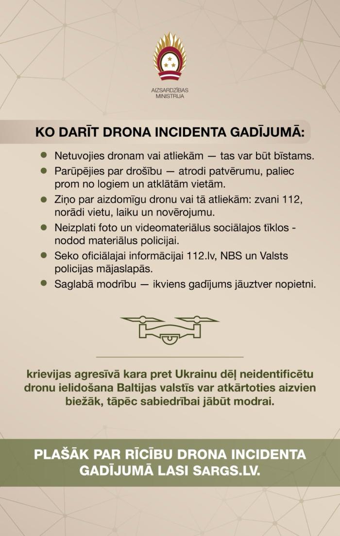 Aizsardzības nozares portāls “Sargs.lv” ir sagatavojis norādījumus iedzīvotājiem, kā rīkoties drona incidenta gadījumā. Aicinām šo informāciju uztvert kā papildinājumu mūsu “72 stundu” sadaļā pieejamajiem materiāliem par sagatavošanos krīzes situācijai.