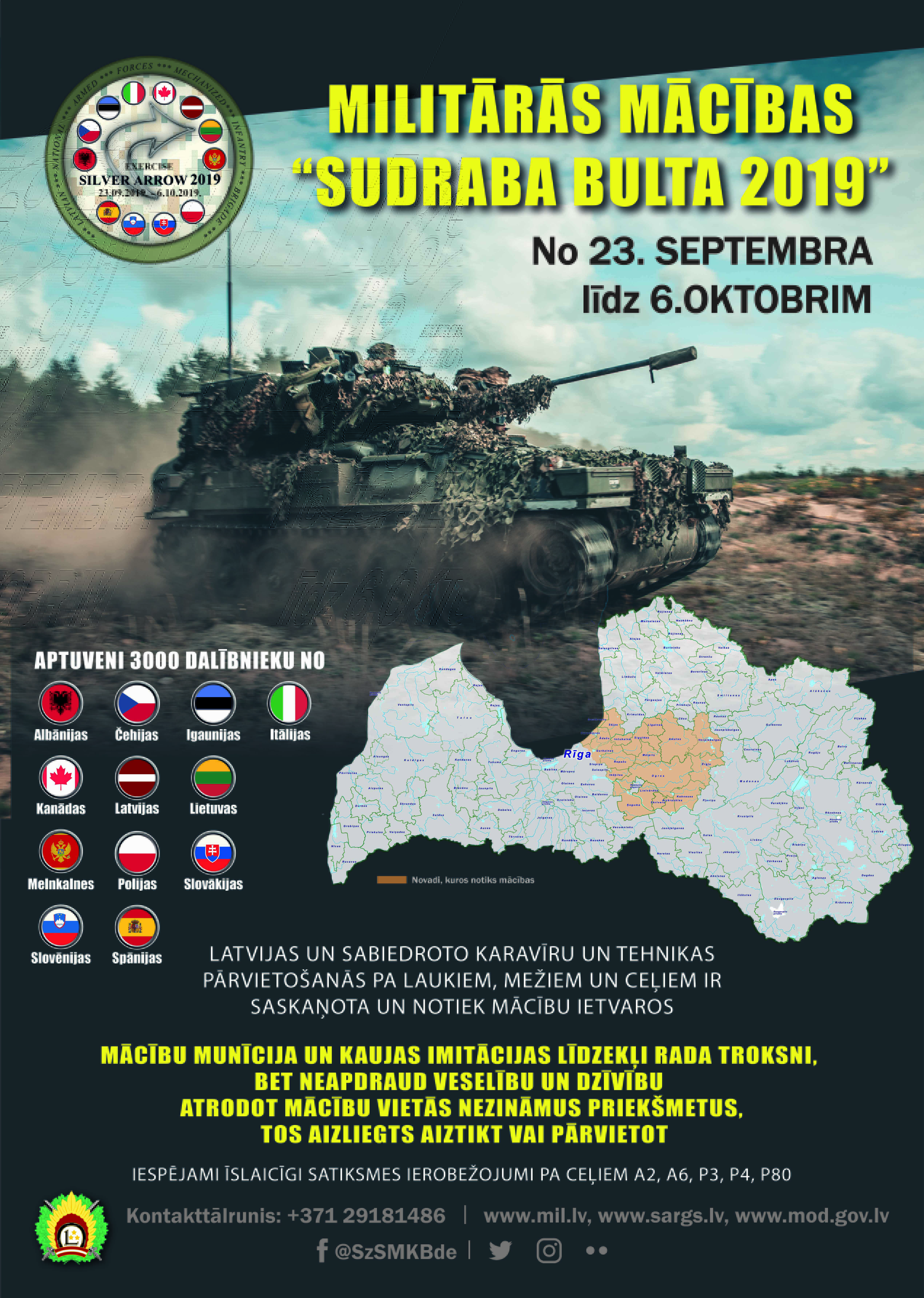 Militārajās mācībās “Sudraba bulta 2019”piedalīsies aptuveni 3000 karavīru no 12 valstīm – Latvijas, Albānijas, Čehijas, Igaunijas, Itālijas, Kanādas, Lietuvas, Melnkalnes, Polijas, Slovākijas, Slovēnijas un Spānijas.