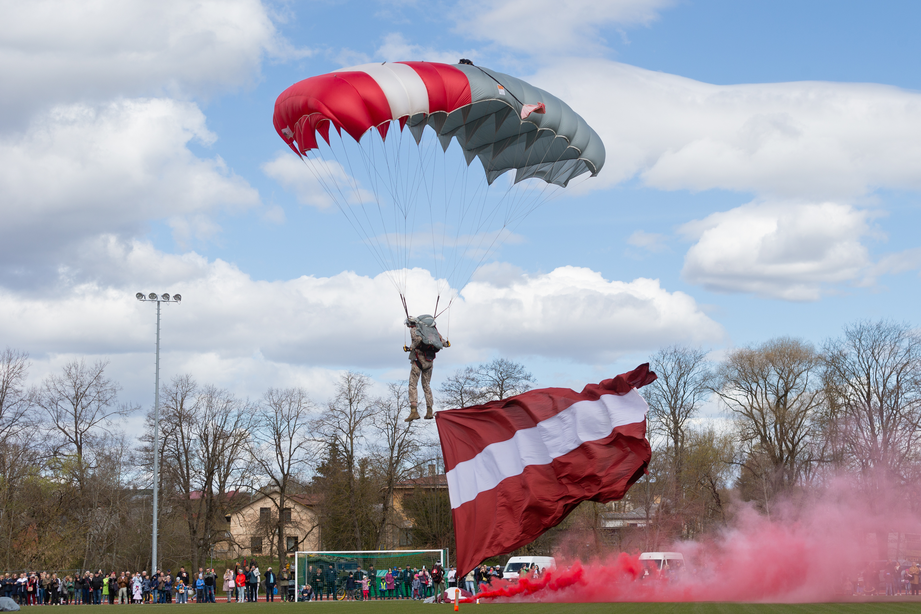 Nedaudz tālāk Saldus sporta kompleksā norisinājās NBS Gaisa spēku izpletņlēcēju nolaišanās, kas pulcēja simtiem cilvēku ap plašo stadiona laukumu. Uzreiz pēc iespaidīgās nolaišanās vadību laukumā pārņēma robežsargi ar dienesta suņu paraugdemonstrējumiem.