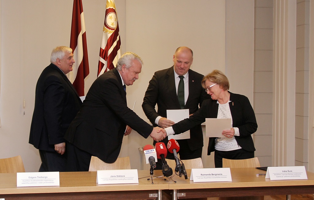 Četru pušu vienošanos parakstīja aizsardzības ministrs Raimonds Bergmanis, zemkopības ministrs Jānis Dūklavs, biedrības “Lauksaimnieku organizāciju sadarbības padome” valdes priekšsēdētājs Edgars Treibergs un biedrības “Latvijas Pārtikas uzņēmumu federācija” padomes priekšsēdētāja Ināra Šure.